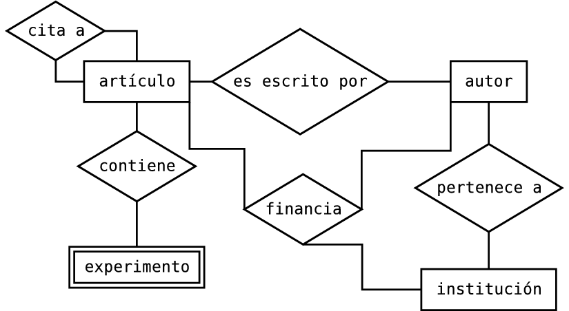 La utilización de estos elementos dará como resultado lo que se denomina el esquema entidad-relación de la base de datos. Los ejemplos que se incluyen en el apartado anterior, gráficamente quedarían como sigue: